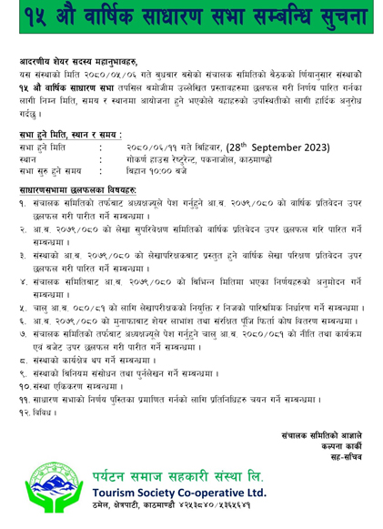 यस पर्यटन समाज सहकारी संस्था लि.को १३ औं वार्षिक साधारणसभाका प्रमुख अतिथिज्यू, अतिथिज्यू,शेयर सदस्यमहानुभावहरु, संचालक समितिका पदाधिकारीहरु, लेखा समिति, ऋण उप–समिति, शिक्षा उप–समिति, लेखा परिक्षक, कर्मचारीवर्ग, पत्रकार महोदय, पर्यटन व्यवसायी साथीहरु,एवं उपस्थित हुनुभएका